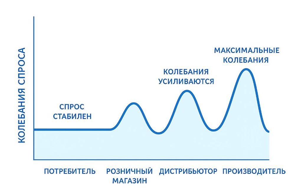 У потребителя спрос относительно стабилен, колебания незначительные. Но чем дальше по цепи, тем сильнее искажения: магазин заказывает чуть больше, дистрибьютор увеличивает ещё сильнее, а производитель реагирует максимально резко. Визуально это выглядит как «усиливающаяся волна»: небольшие изменения внизу превращаются в крупные пики и провалы наверху.